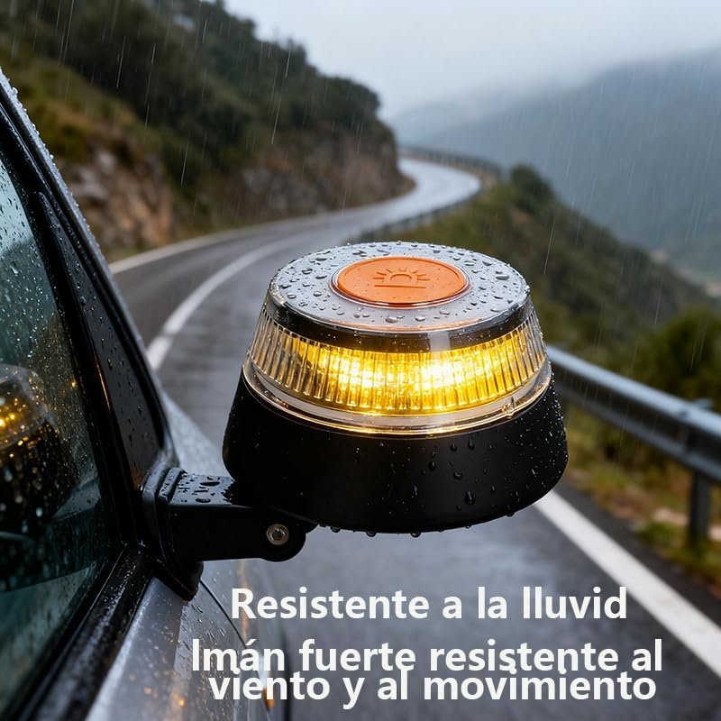 Su función principal es advertir al resto de conductores de tu presencia en la vía con una luz amarilla auto-rotativa visible a 360 grados. Esta visibilidad puede alcanzar hasta un kilómetro de distancia en condiciones normales, lo que multiplica considerablemente las posibilidades de que otros vehículos te detecten con antelación suficiente.