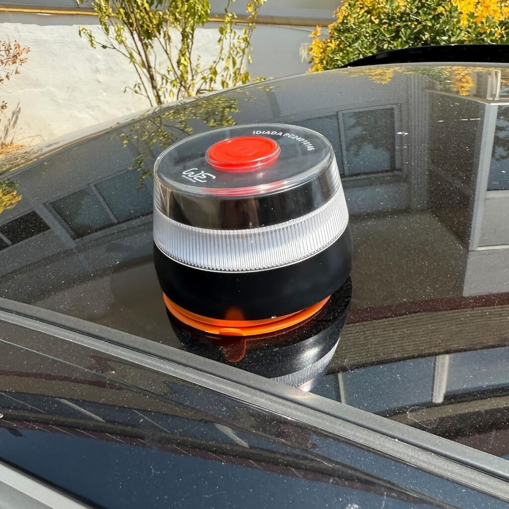 La baliza V16 es un dispositivo luminoso de emergencia diseñado para señalizar vehículos inmovilizados en la carretera. A diferencia de los triángulos tradicionales que has usado durante años, este sistema se coloca directamente sobre el techo del coche mediante un imán, sin necesidad de salir del vehículo ni exponerte al tráfico.